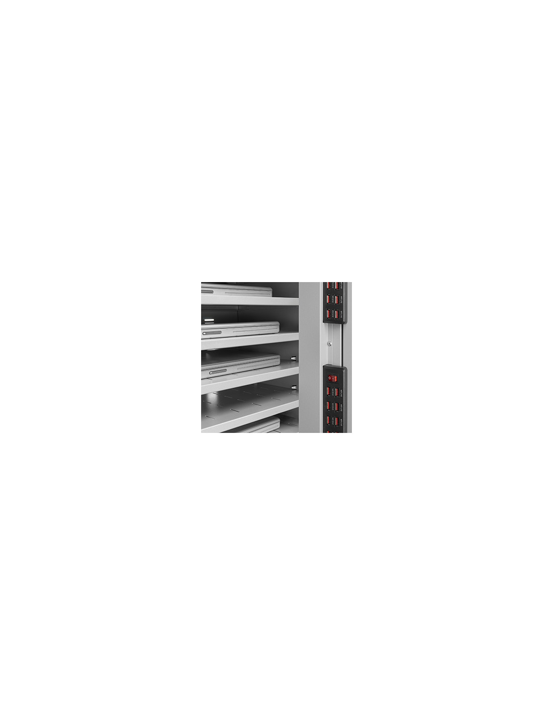 Armario transportable mediante ruedas con capacidad para cargar y almacenar hasta 24 ordenadores portátiles o 36 netbooks. Estructura monobloque en chapa de acero pulida color gris, con puertas batientes, cerradura y llaves. Medidas: 950 x 450 x alto 1000 mm. Provisto de 12 bandejas y cierre de seguridad frontal con cerradura. Su asa lateral y ruedas facilitan el transporte del armario y los frenos de sus ruedas delanteras permiten fijar el armario en la posición requerida. También disponibles modelos con mayor capacidad (para 32 ó 40 portátiles). Sistema de ventilación mediante aperturas en la parte frontal, posterior e inferior del armario. Dispone de toma de corriente individual para cada portátil.