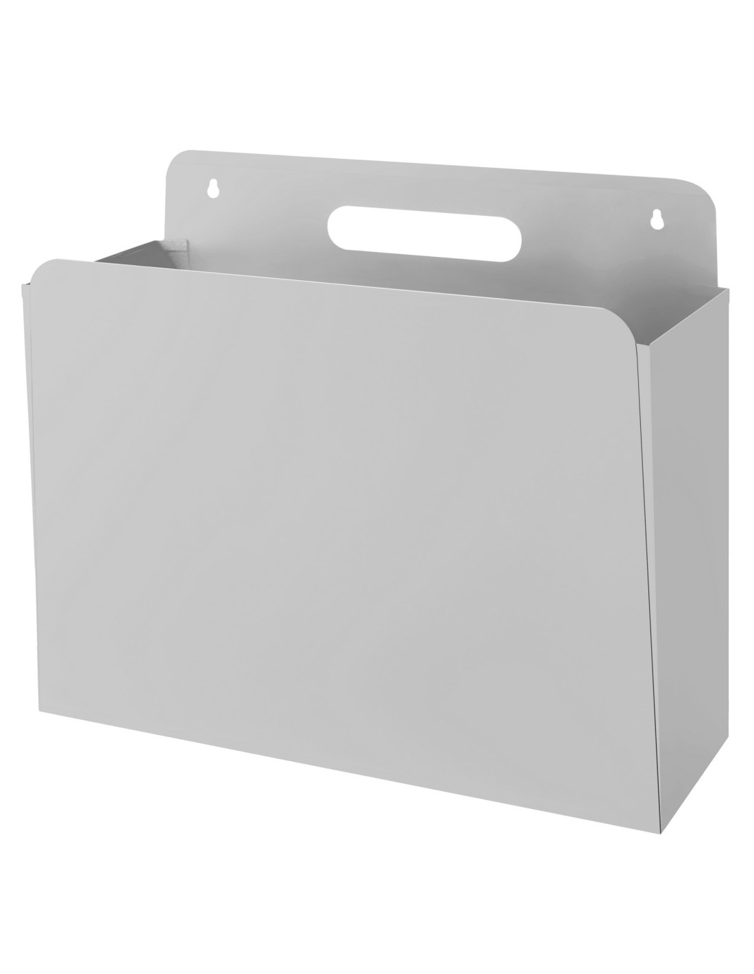 Papelera metálica con anclaje a pared. Medidas 350 x 135 x alto 290 mm. Pintada color a elegir dentro de la gama (negro, grafito, gris claro, azul, burdeos). También disponible en acero inoxidable,